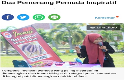 Tak hanya sekedar ide dan konsep, Nurul pun merealisasikan inovasinya dengan menunjukkan dan memperagakan penggunaan alatnya kepada juri. “Penggunaan bunga sukun ini lebih efisien daripada produk komersial yang saat ini beredar di pasaran,” lanjutnya. Inovasi tersebut meraih peringkat Juara Pertama Putri Pada Ajang Lomba Pemuda Inspiratif Sulawesi Barat dan Menjadi Delegasi Ke-tingkat Nasional yang akan di adakan di Banten .